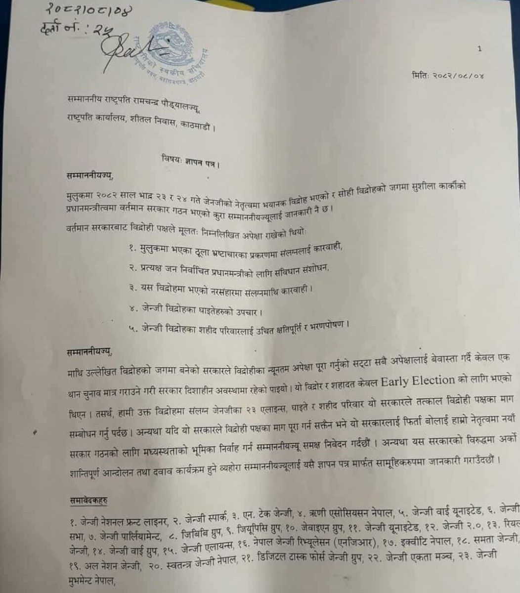 ‘जेन-जी नेसनल फ्रन्ट लाइनर’, ‘जेन-जी पार्लियामेन्ट’, ‘स्वतन्त्र जेन-जी नेपाल’ लगायतका २३ संस्थाले संयुक्त रूपमा बुझाएको पत्रमा पुराना दल वा पात्रको विकल्पमा आन्दोलनको नेतृत्वकर्ताहरूकै हातमा सत्ताको बागडोर हुनुपर्ने सङ्केत गरिएको छ।